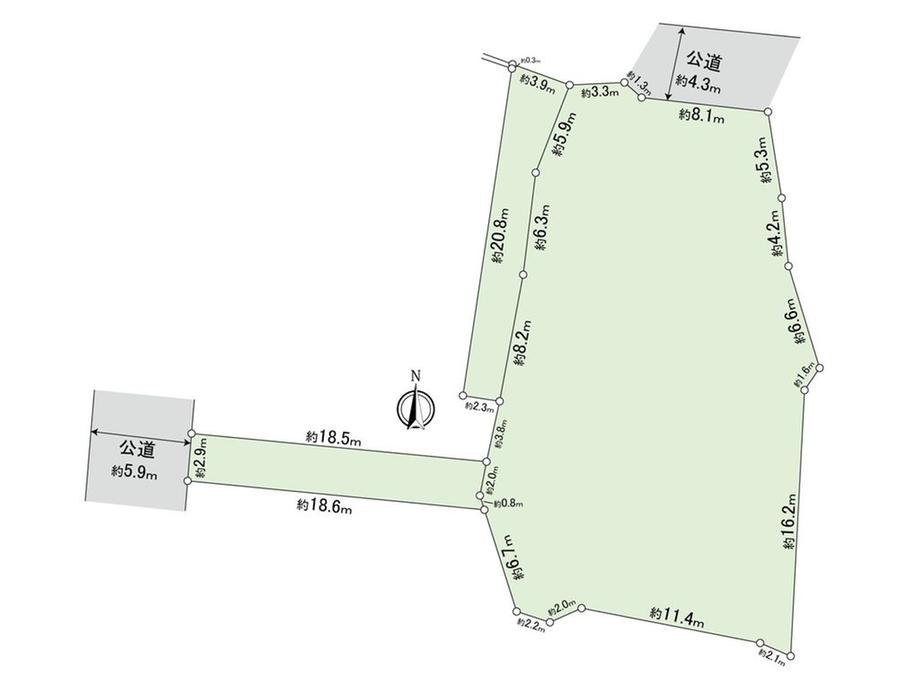 | 建ぺい率・容積率 | 60%・100% | 私道負担・道路 | 無、北4.3m幅(接道幅16.6m)、西5.9m幅(接道幅2.8m) | ||