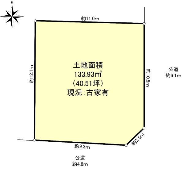 | 建ぺい率・容積率 | 60%・100% | 私道負担・道路 | 無、南4.8m幅(接道幅9.3m)、東6.1m幅(接道幅10.5m) | ||