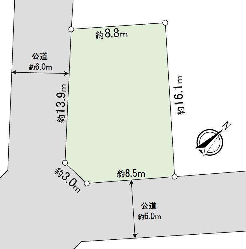 | 建ぺい率・容積率 | 60%・200% | 私道負担・道路 | 無、南東6m幅(接道幅8.5m)、南西6m幅(接道幅13.9m) | ||