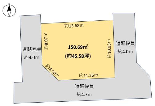 建ぺい率・容積率 | 50%・80% | 私道負担・道路 | 無、南4.7m幅(接道幅11.3m)、東4m幅(接道幅10.9m)、西4m幅(接道幅8m) | ||