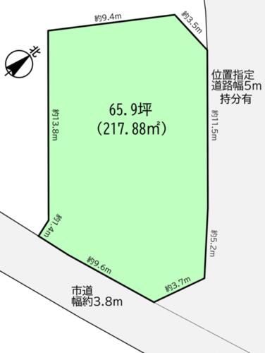 | 接道状況 | 南東 3.8m 公道 接面9.6m北東 5.0m 私道 接面20.4m 位置指定有 | ||||