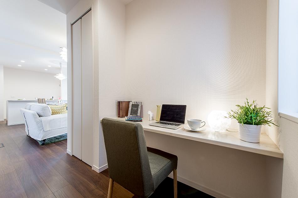 【スタディコーナー】多目的に使えるカウンター付きのファミリースペース。個々に勉強するのではなく、子供同士や親が子供の横に並び、勉強ができる場所です。/弊社施工例