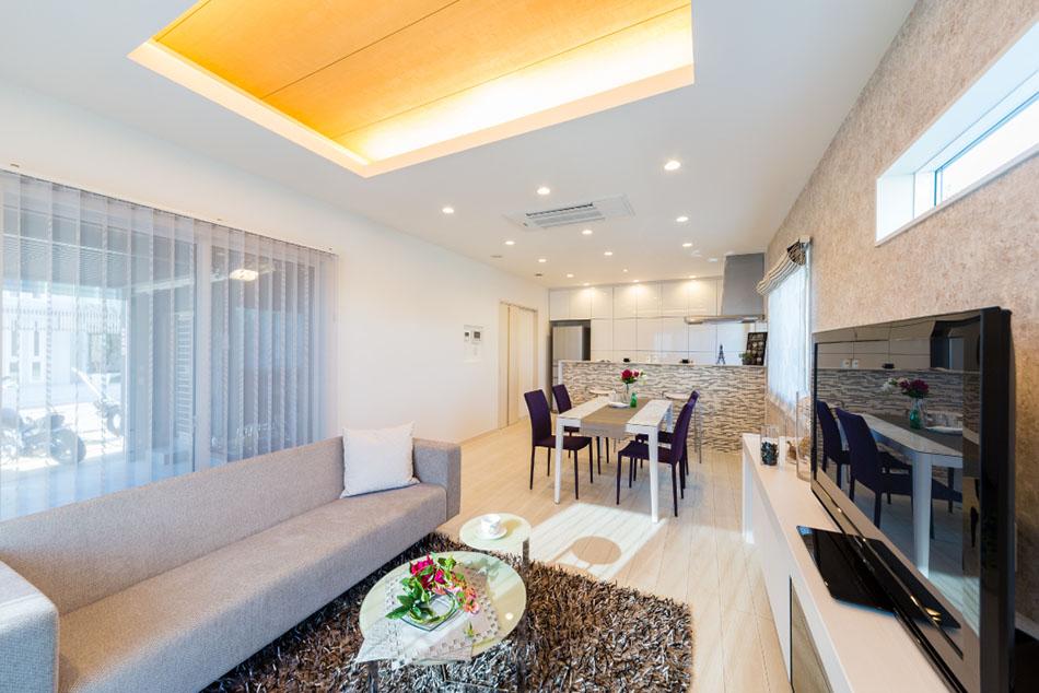 【折上天井】折上天井に間接照明を設置しているため温かい雰囲気の空間を演出してくれます。ゆったりとした明るい空間でご家族団らんの時をお楽しみいただけます。/弊社施工例