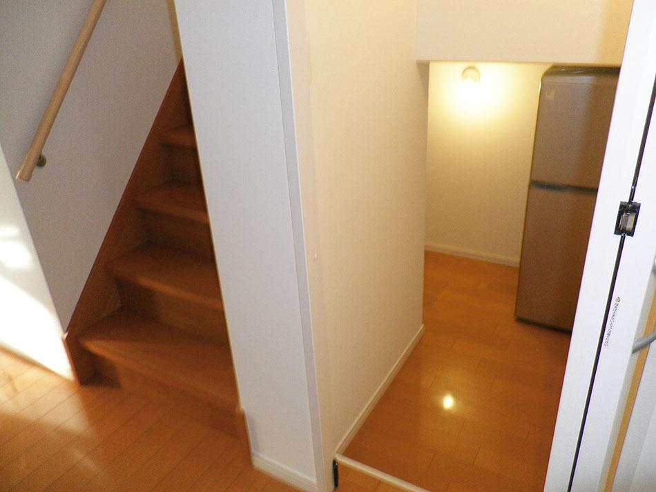 【階段下収納】デッドスペースとなってしまう階段下スペースを有効活用した収納。掃除道具などの生活用品の収納に役立ちます。/弊社施工例