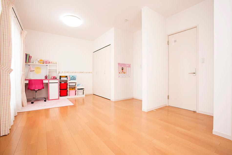 【将来設計対応子供部屋】将来大きな部屋が必要になった時、簡単なリフォームに対応可能です。お部屋を分けても各居室に収納が確保できるように設計されています。/弊社施工例