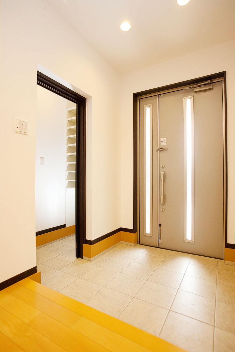 【土間収納】ゴルフバッグにベビーカー、雨の日の長靴など置き場に困る外で使用するものをしっかり収納できます。土間続きの収納は汚れも気にせずそのまましまえるので、手間もかかりません。/弊社施工例