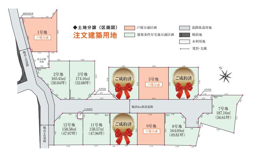 【全体区画図】開放的な角地や敷地を有効活用できる整形地を含む全12区画です。土地面積は46坪~56坪超。車の通り抜けができない、安心の街区設計です。