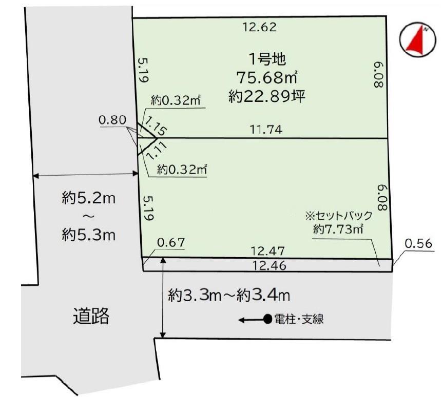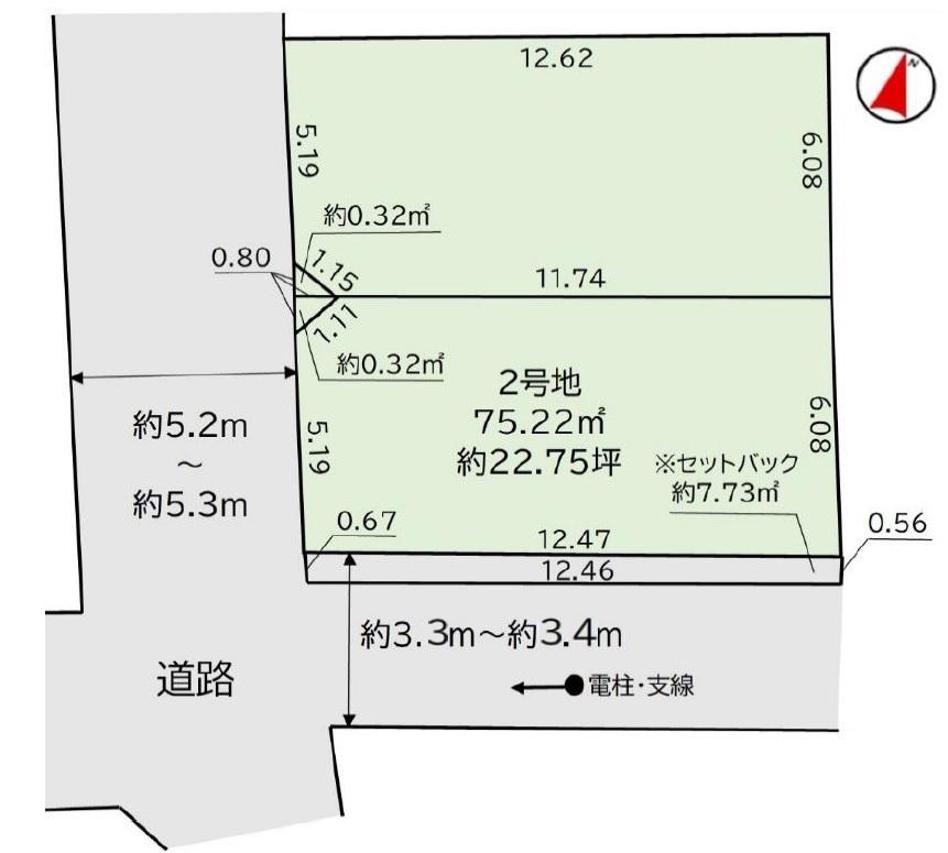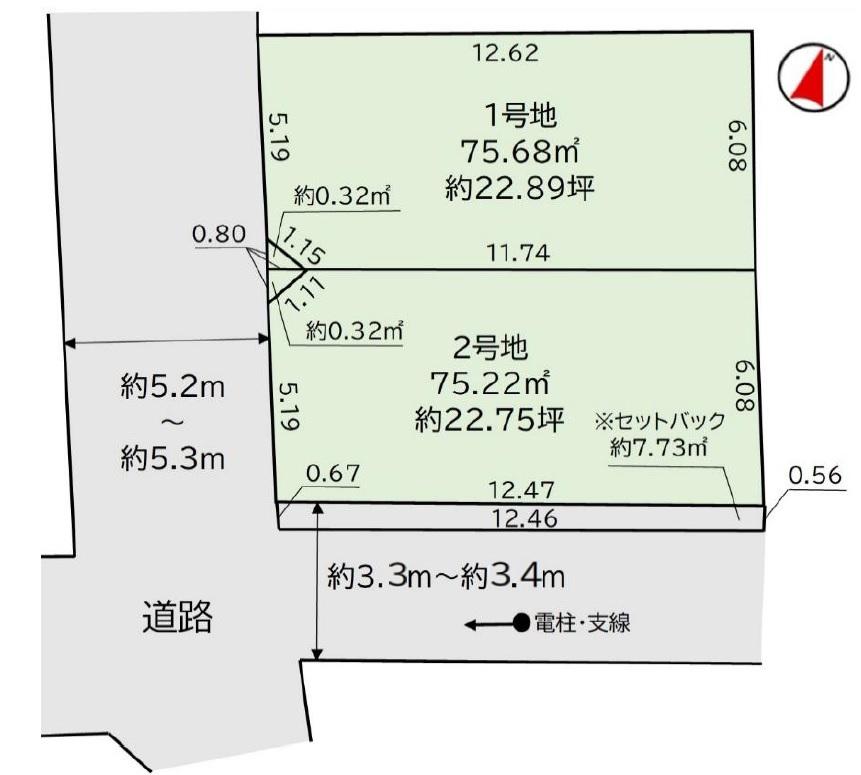 | 建ぺい率・容積率 | 建ぺい率:60%、容積率:200% | 私道負担・道路 | 道路幅:3.3m~5.3m、アスファルト舗装、■西側約5.2m~5.3m公道 ■南側約3.3m~3.4m公道 ■セットバック②約7.73㎡ ■協定部分①②約0.32㎡ | ||