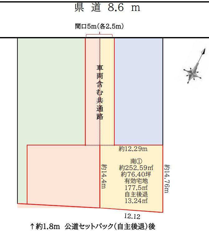 | その他制限事項 | セットバック:要13.24㎡、景観法による規制有、安全条例による規制有、高さ最高限度有、敷地面積最低限度有、日影制限有、一部都市計画道路、都市計画法第43条の再建築要件を満たす(建築申請に基づく許可を得ること。買主の自身居住用住宅であること。)ことで、現住所を問わずどなたでもご自身が建てたいハウスメーカーでの建築が可能です。・本物件の間口は隣地部分を合わせた共通路となりますので、敷地の出入りは5mの幅員があります。・南側はセットバックを要し図はセットバック後となります。・別途、敷地内への水道・都市ガスの引き込み工事及び浄化槽の新設を要し、その費用が掛かります。※浄化槽の設置は県との協議を要します。この際に、県道への放流の許認可を得られない場合、他の排水方法にしなければなりません。・敷地の接する道路に下水道配管の埋設はありません。・外構の新設は買主の負担となります。 | ||||