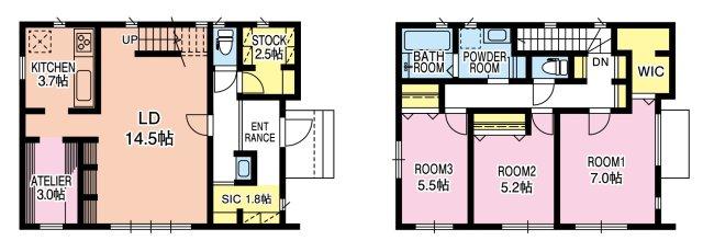 (※3LDK+アトリエ 参考プラン) ジブンハウス【ミュージアム】 建物価格:2139万1597円。延床面積:106.40㎡(約32坪) 3帖のアトリエルームは書斎やワークスペース、趣味の部屋として♪