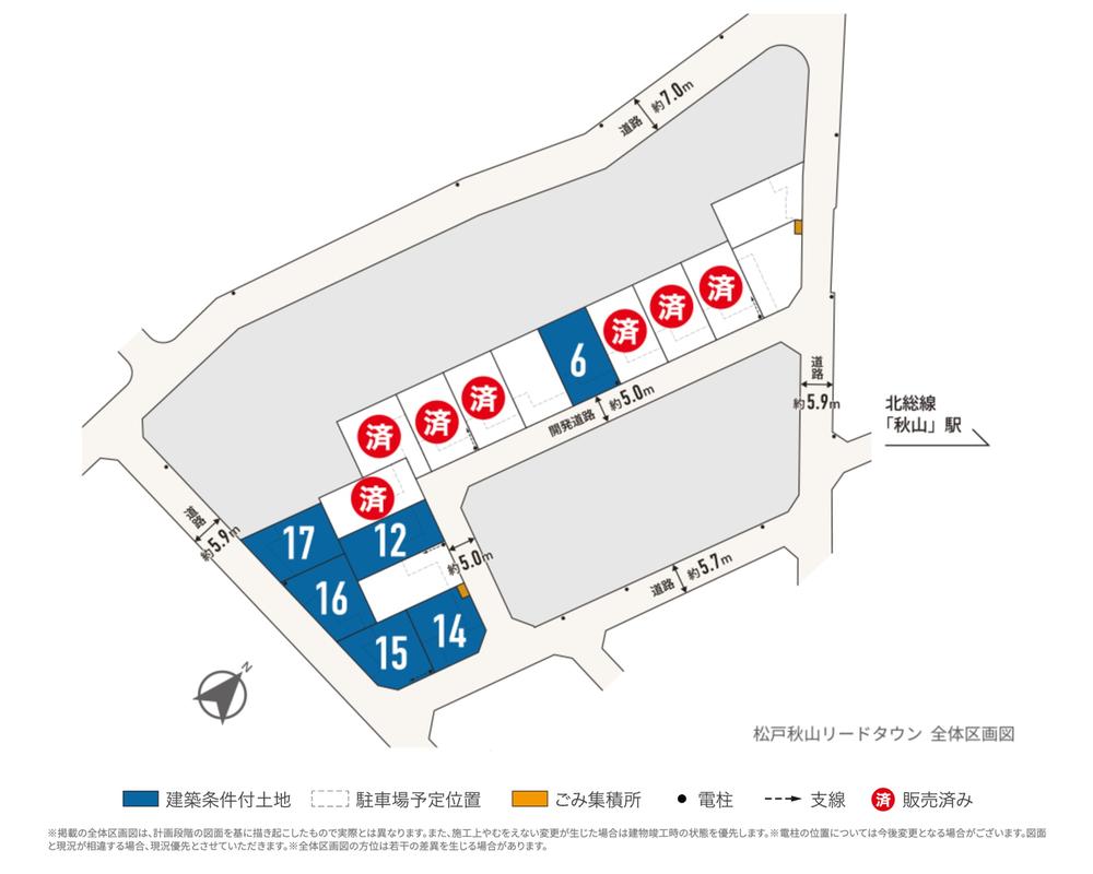 備考 | 設備:東京電力・都市ガス(京葉ガス)・公営水道・公共下水道、開発許可番号:松戸市指令第9号の53(令和6年3月7日)、開発面積:2929.14㎡、松戸秋山リードタウンまちなみデザインガイドラインがあります。■建築条件付土地分譲のご案内:この土地は土地売買契約締結後3ヵ月以内に東京セキスイハイム株式会社と住宅の建築工事請負契約を締結していただくことを条件として販売いたします。 この期間中に建築工事請負契約が成立しなかった場合は、土地売買契約は白紙となり受領した金銭は全額無利息にてお返しいたします。■第1期、第1期2次先着順販売物件概要備考:■先着順申込みの為、申込済み・契約済みの場合がございます。予めご了承ください。■お持ちいただくもの:お認印・収入証明書(給与収入のみの方:直近2年分源泉徴収票、給与収入のみ以外の方:確定申告書一式の写し[直近3期分])・身分証明書(運転免許証等)※1:掲載の所要時間は徒歩の場合は80mを1分で算出しています。※2:通勤時34~40分。日中時33分。北総鉄道北総線利用。※掲載の所要時間は「Yahoo!路線情報」2024年5月調べ。 | ||||