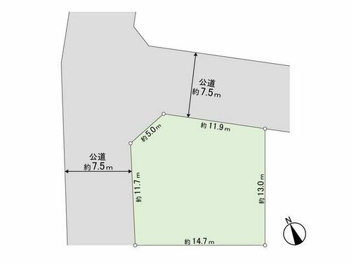 | 接道状況 | 北東 7.5m 公道 接面11.9m北西 7.5m 公道 接面11.7m | ||||
