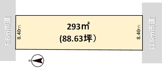 | 建ぺい率・容積率 | 60%・200% | 私道負担・道路 | 無、北5.8m幅(接道幅8.4m)、南11.9m幅(接道幅8.4m) | ||