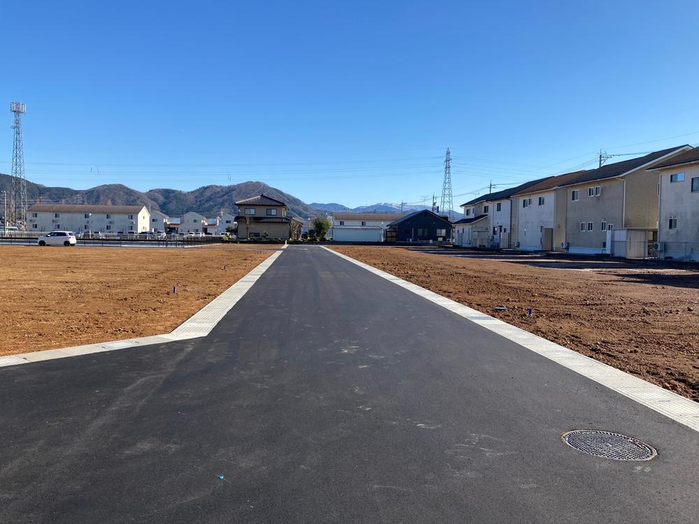 6号地から1号地方向を撮影。道路幅6mです。道路との高低差がなく、敷地全体を有効に活用できます。