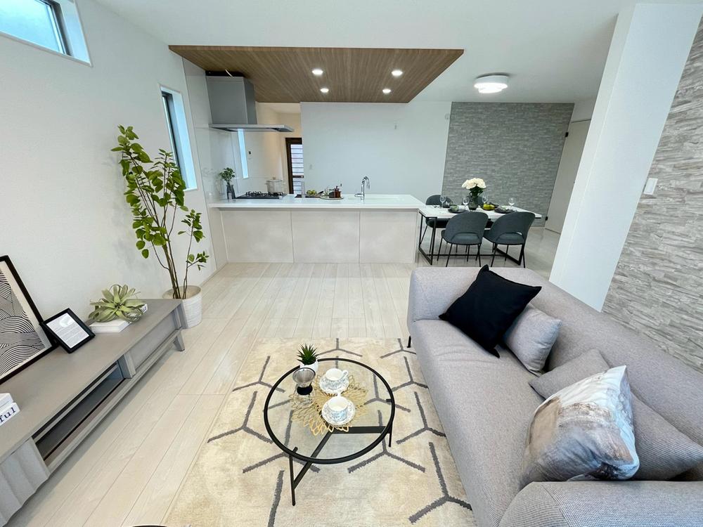 大きなソファを置いても広々としたリビング!アクセントクロスでより立体感を演出しております。建物プラン例:建物価格1700万円、建物面積101.84㎡※本分譲地に建築可能なプラン※坪50万円で増坪可能です