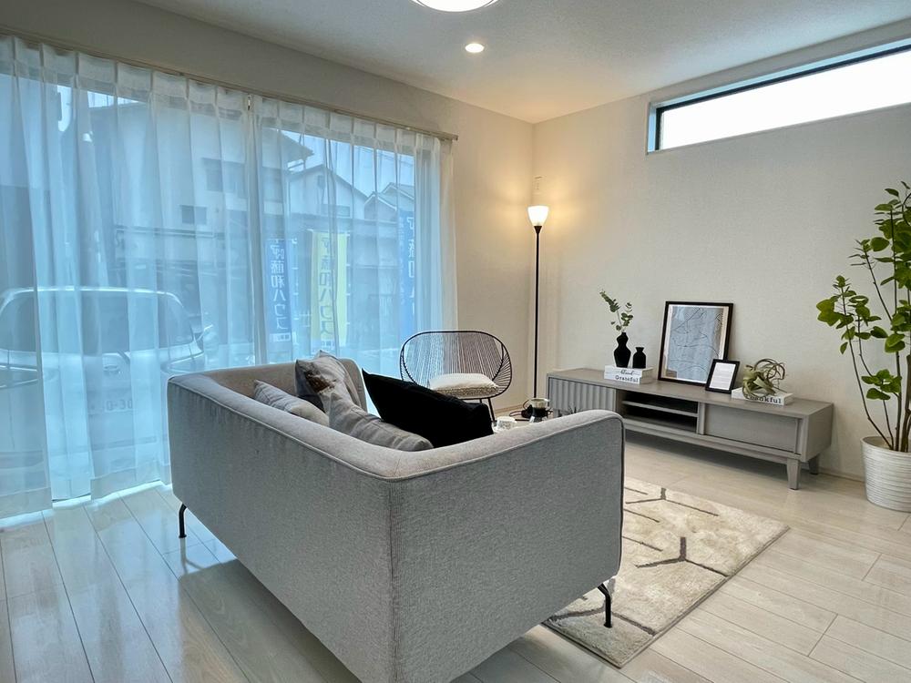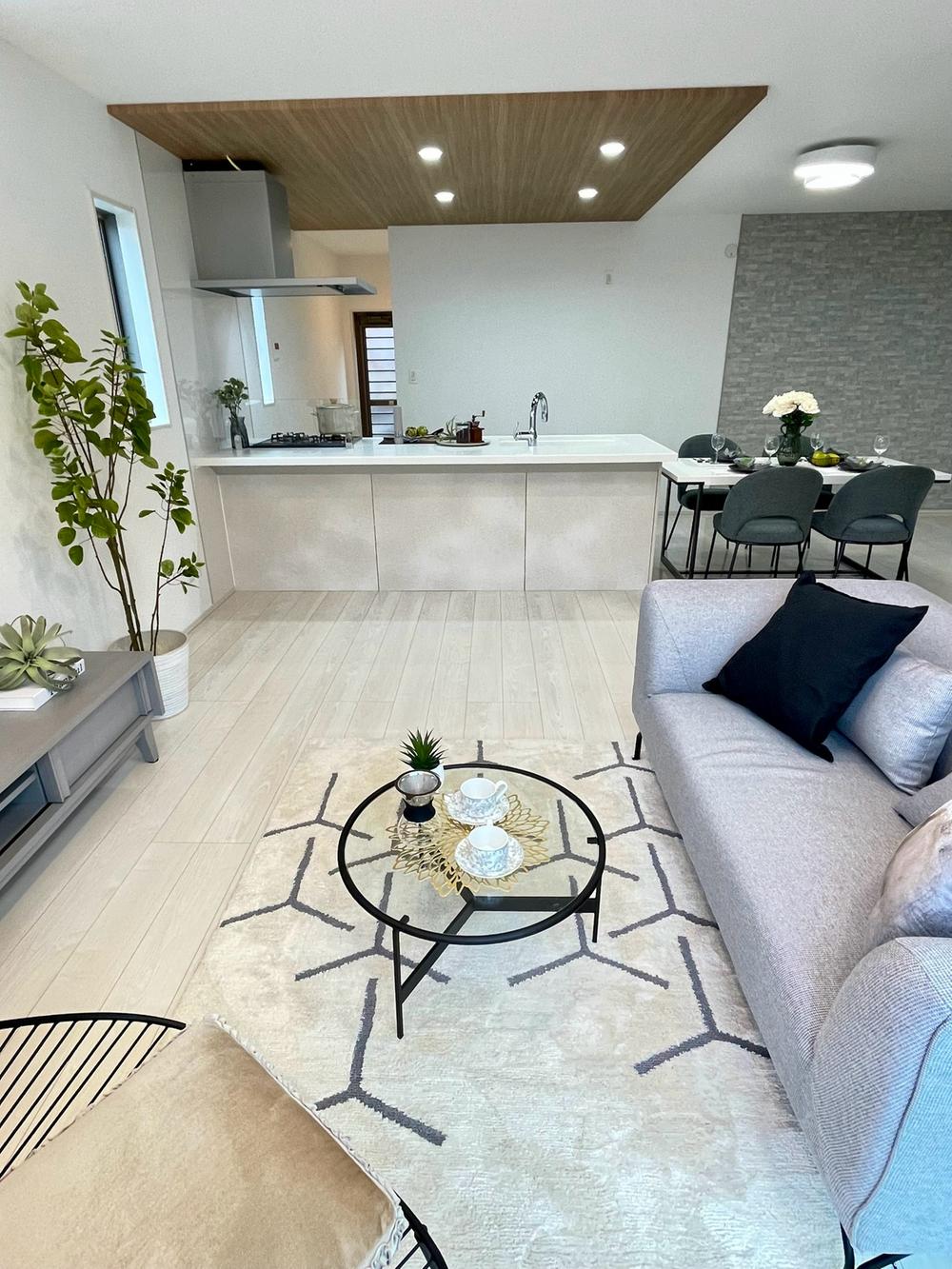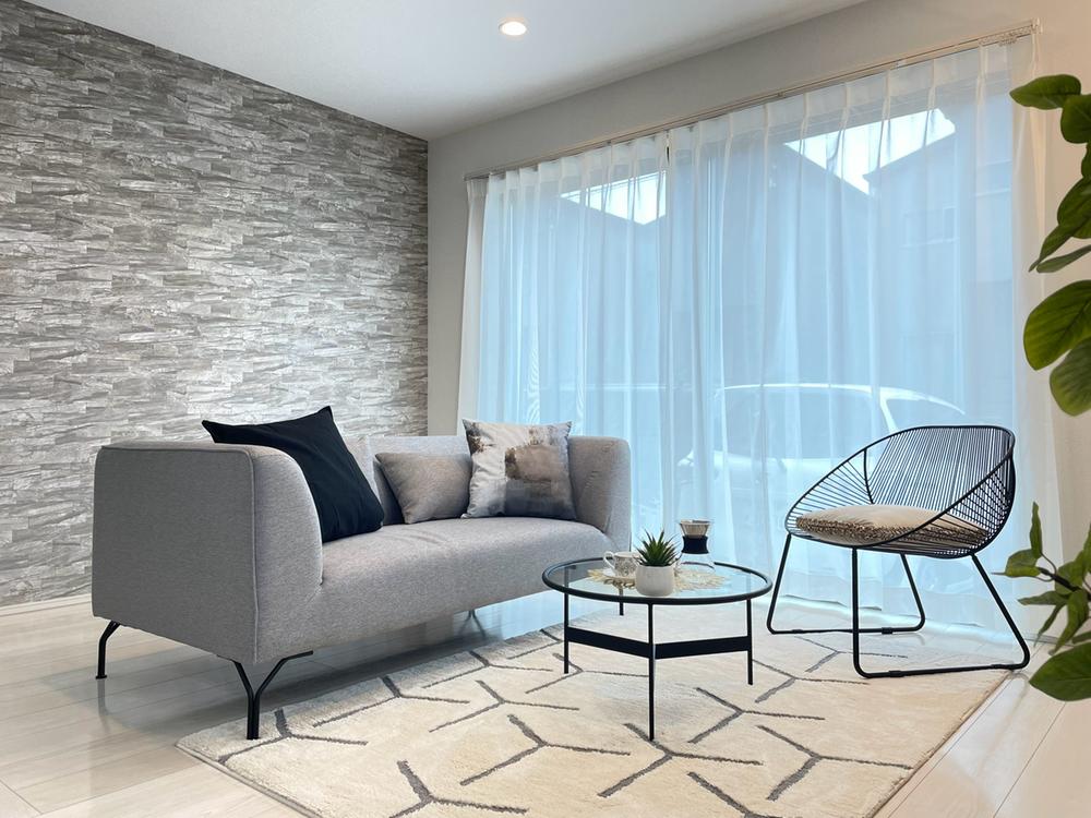 大きなソファを置いても広々としたリビング!アクセントクロスでより立体感を演出しております。建物プラン例:建物価格1700万円、建物面積101.84㎡※本分譲地に建築可能なプラン※坪50万円で増坪可能です