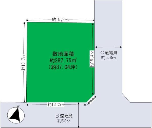 | 建ぺい率・容積率 | 60%・80% | 私道負担・道路 | 無、北東5.8m幅(接道幅16.4m)、南東5.8m幅(接道幅13.2m) | ||