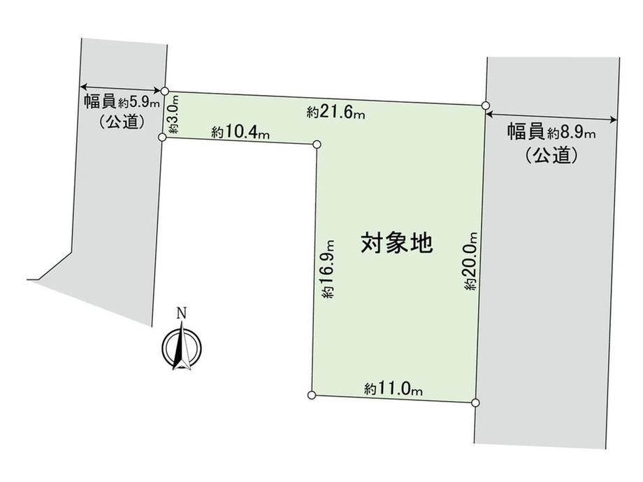 | 建ぺい率・容積率 | 50%・80% | 私道負担・道路 | 無、東8.9m幅(接道幅20m)、西5.9m幅(接道幅3m) | ||