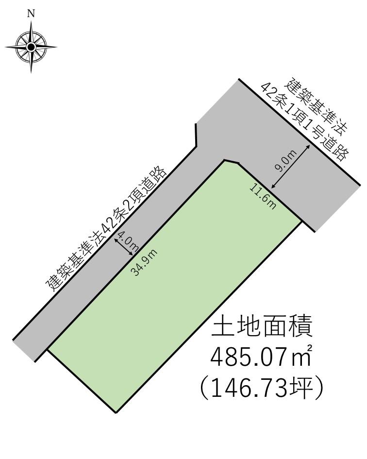 | 建ぺい率・容積率 | 80%・400% | 私道負担・道路 | 無、北東9m幅(接道幅11.6m)、北西4m幅(接道幅34.9m) | ||