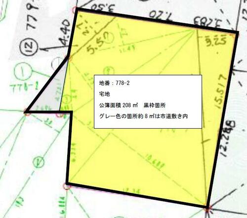| 備考 | 公簿面積について現状有姿売買となります。上水道引き込み無、分担金20万(税別)必要です。引き込み工事要、浄化槽の設置必要。公募面積208㎡は市道敷き約8㎡を含む。 / 条件等:現況渡し | ||||