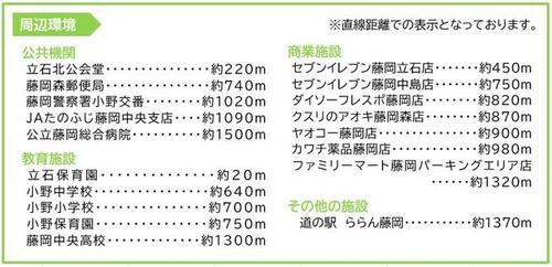 | 備考 | ※上水引込み渡しです。※下水区域です。※現在D区画の南側歩道に縁石の切り下げがありません。目的用途に応じて一部歩道の縁石の切り下げ後お引き渡しします。(幅、位置は要相談)※F区画予約あり・私道負担:なし・【アーキスおぎわら】藤岡市立石6区画分譲用地!建築条件なし!人気の藤岡市立石小野小・小野中校区です!北藤岡駅まで徒歩約5分!立石保育園まで徒歩約1分!小野小・小野中まで徒歩約10分! / 条件等:現況渡し | ||||