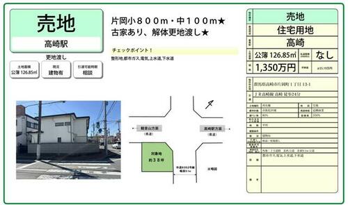 | 備考 | 私道負担:なし・周辺にスーパー、コンビニ、病院、学校などが揃う好立地です★片岡中学校まで100m★ローソンも100m以内で生活が便利です!目の前にバス停もあり高崎駅や国立病院にもアクセスが良く通勤・通院にも最適です★・仲介手数料:不要 / 条件等:更地渡し | ||||