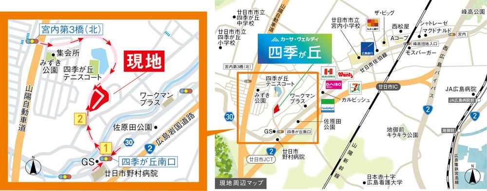 廿日市市「四季が丘南口バス停」歩6分 広島電鉄宮島線「地御前」歩33分 JR山陽本線「宮内串戸」歩35分 | ||||