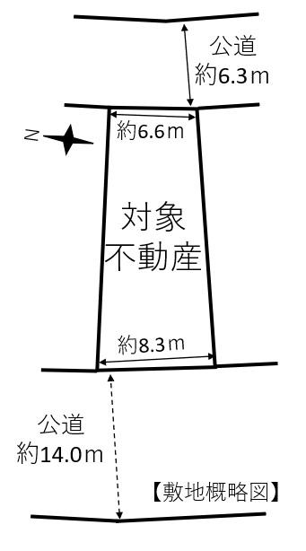 | 建ぺい率・容積率 | 40%・80% | 私道負担・道路 | 無、西14m幅(接道幅8.3m)、東6.3m幅(接道幅6.6m) | ||
