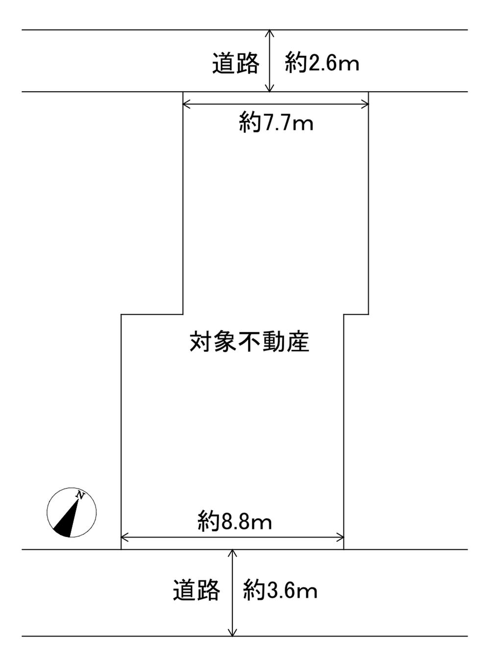 | 建ぺい率・容積率 | 60%・200% | 私道負担・道路 | 無、南東3.6m幅(接道幅8.8m)、北西2.6m幅(接道幅7.7m) | ||