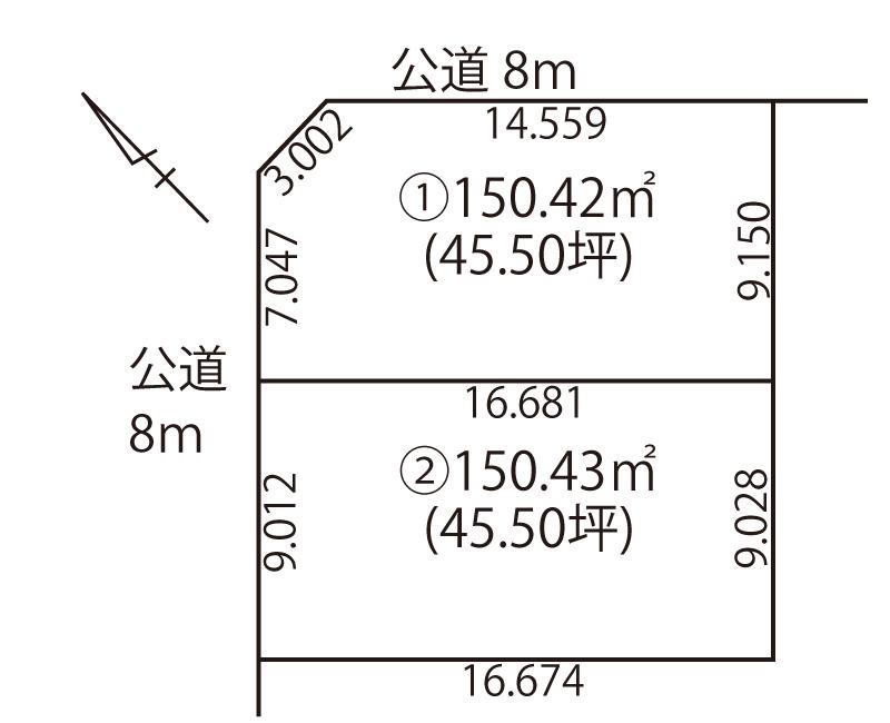 | 建ぺい率・容積率 | 建ペい率:60%、容積率:200% | 私道負担・道路 | 道路幅:8m、アスファルト舗装、北西側8m公道、北東側8m公道 | ||