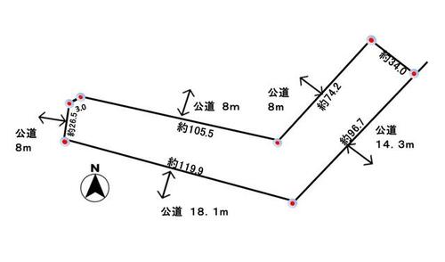 | 接道状況 | 南 18.1m 公道西 8.0m 公道 接面26.5m北 8.0m 公道東 14.3m 公道 接面96.7m | ||||