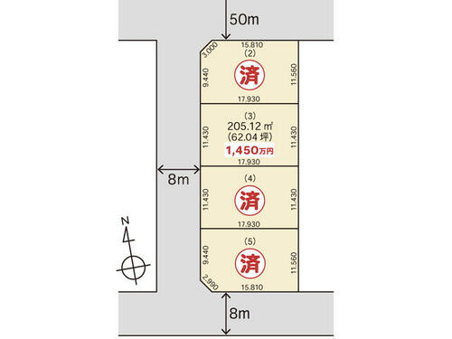 | 接道状況 | 北 50.0m 公道 接面15.8m西 8.0m 公道 接面11.4m南 8.0m 公道 接面15.8m | ||||