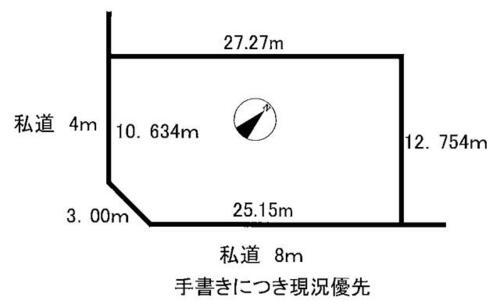 接道状況 | 南東 8.0m 私道 接面25.1m南西 4.0m 私道 接面10.6m | ||||