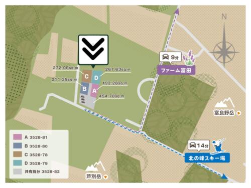 | 備考 | 分譲用地には共用部分の通行権が付帯しています。C区画とのセット販売も可能です。建築業者や民泊運営代行会社の紹介も対応可能で、購入後の活用もスムーズに進められます。・整地済みで即建築可!ファーム富田まで車で9分、スキー場へ17分。2階から十勝連峰の絶景を望む好立地。建築業者・民泊運営代行の紹介、収支試算や資金調達支援も可能です。 | ||||