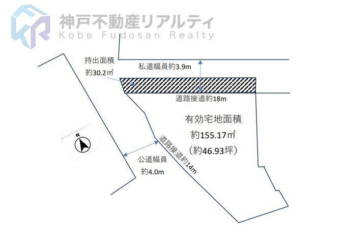 | 建ぺい率・容積率 | 70%・160% | 私道負担・道路 | 30.2㎡、北東3.9m幅(接道幅18m)、西4m幅(接道幅14m) | ||