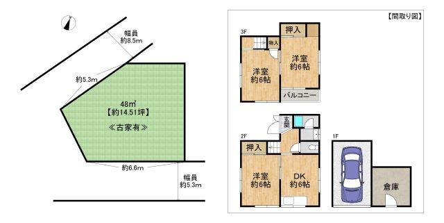 | 建ぺい率・容積率 | 60%・200% | 私道負担・道路 | 無、北西6.6m幅(接道幅5.3m)、南6m幅(接道幅6.6m) | ||
