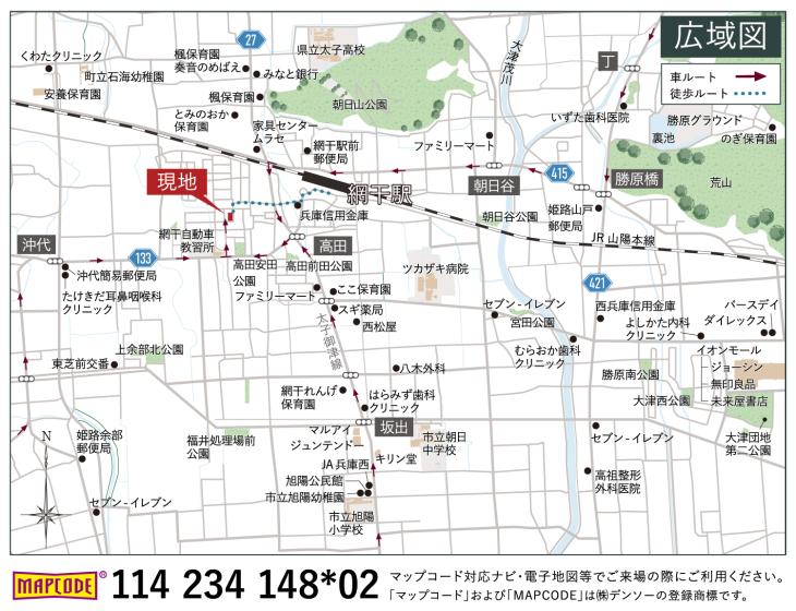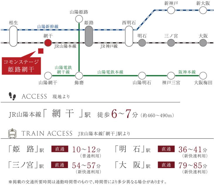 JR山陽本線「網干」駅まで490m 徒歩7分。駅まで平坦な道のりで、始発の便も多いため通勤・通学も快適です。「姫路」駅へ直通10~12分、新快速利用で「三ノ宮」駅へ直通54~57分でアクセス可能です。