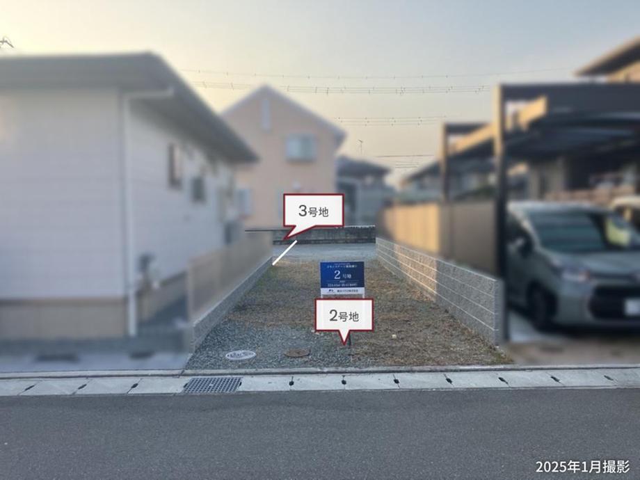2号地は約67.89坪、通行人の視線が届きにくい旗竿地です。プライバシーを守りながら、ゆっくりとお寛ぎいただけます。/2025年1月撮影