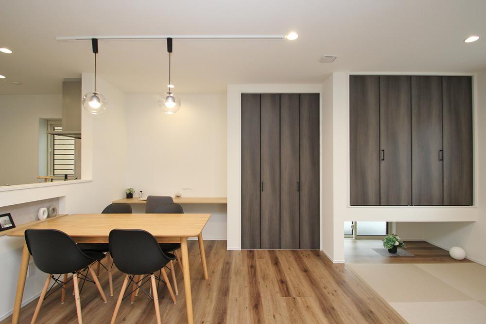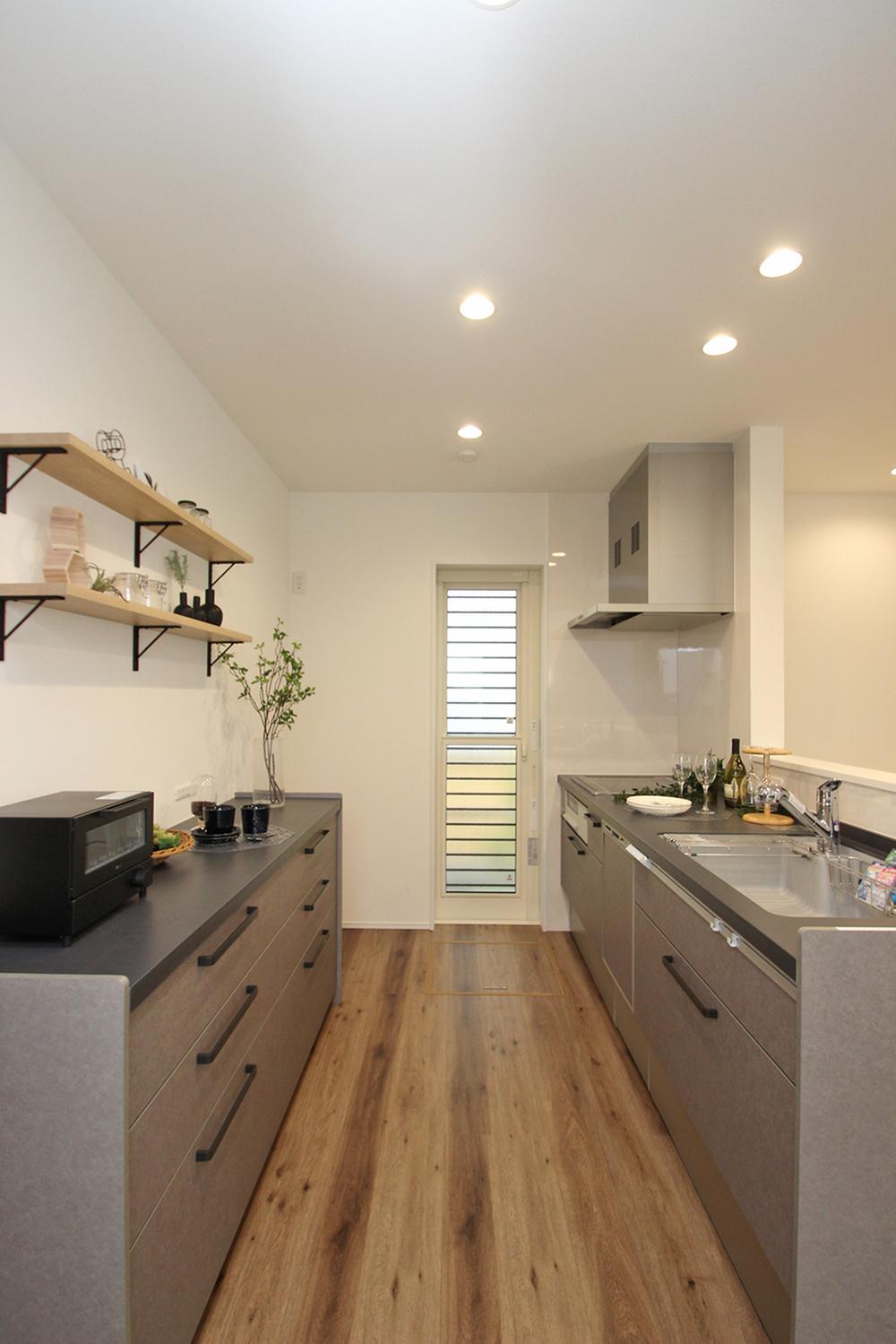 調理中でも家族と会話をしやすく、お子様の様子が見守れる配置。キッチン横の扉は洗面室につながる水回りをまとめた家事動線のある間取り!【プラン例】建物価格2380万円、建物面積110.95㎡