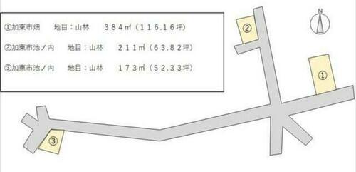 | 備考 | ※3区画一括での販売となります。個別販売は別途相談要。※上水道の引込費用は買主負担です。※下水道未供給エリア。浄化槽の設置が必要です。整備費用は買主負担です。※売主の契約不適合責任免責※現況渡し※地目変更は買主負担です。※湖翠園分譲地内。分譲地規約による負担金等ある場合、買主負担です。※道路は自治会所有・■南向きの約116坪敷地■南東角地の約63坪敷地■北西角地の約52坪敷地 / 条件等:現況渡し | ||||