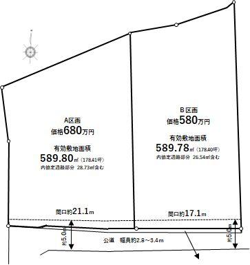 | 建ぺい率・容積率 | 建ペい率:60%、容積率:160% | 私道負担・道路 | 道路幅:2.8m~3.4m、アスファルト舗装、現地道路幅員が約5.0mになるよう、協定通路部分有り。 | ||