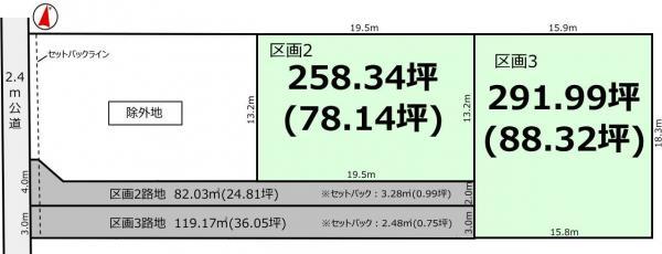 | 建ぺい率・容積率 | 建ぺい率・容積率:60%・200% | 私道負担・道路 | 道路幅:2.4m、接道1:一方 公道 西 幅員2.4m/セットバック要/私道無 | ||