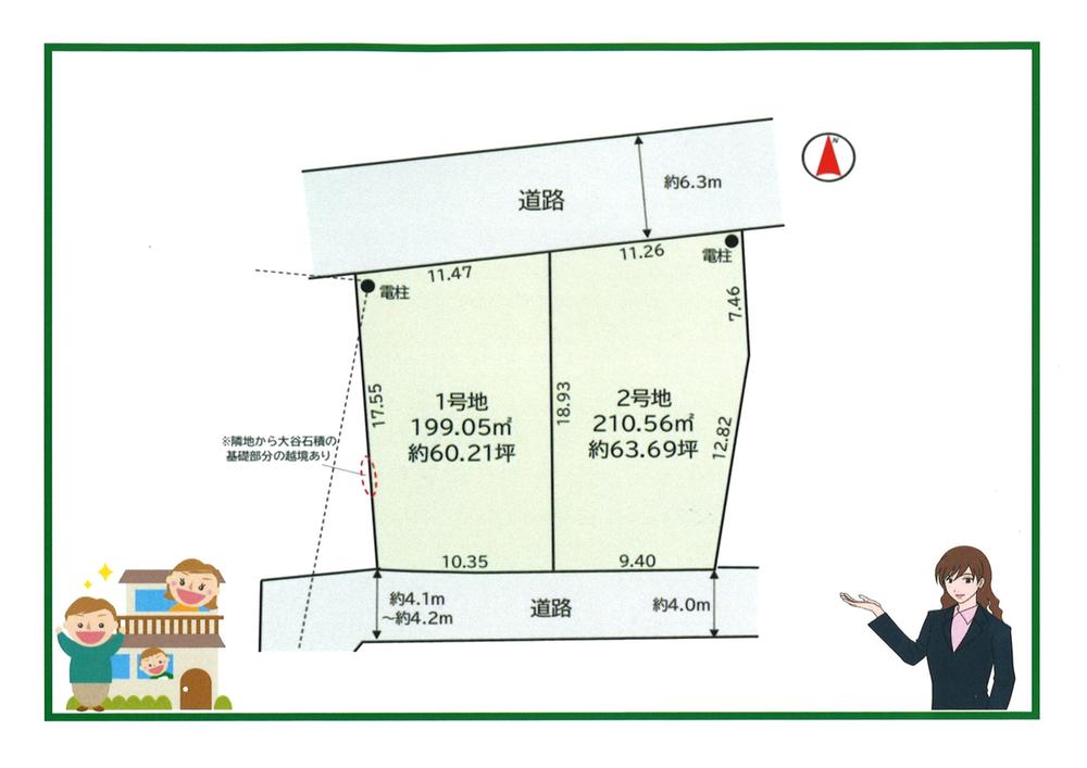 | 建ぺい率・容積率 | 50%・100% | 私道負担・道路 | 無、北6.3m幅(接道幅11.4m)、南4.2m幅(接道幅10.3m) | ||
