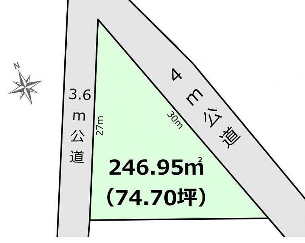 | セットバック | 無 | 接道状況 | 角地 ( 北東 4m 公道 間口30m ) ( 西 3.6m 公道 間口27m ) | ||