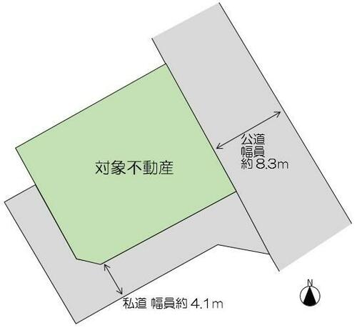 | 接道状況 | 東 8.3m 公道 接面16.8m南 4.1m 私道 接面17.7m 位置指定有 西 4.1m 私道 接面9.6m 位置指定有 | ||||