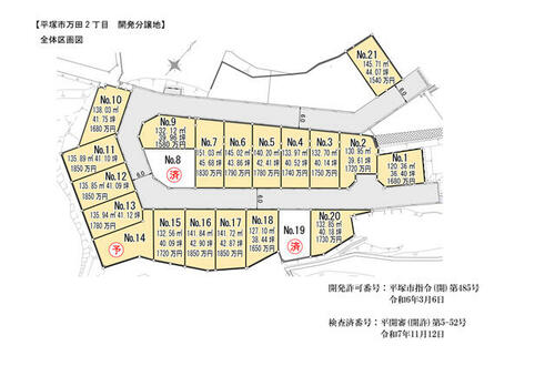 | 備考 | セットバック:済・私道負担:なし・他交通手段:JR東海道本線平塚駅バス22分上万田停歩6分・全21区画の開発分譲地 高台で開放感・陽当り良好です。・仲介手数料:不要 / 条件等:相談 | ||||
