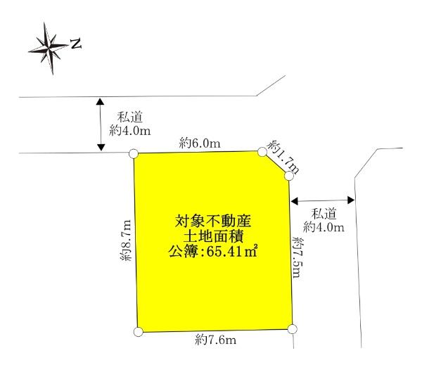| 建ぺい率・容積率 | 60%・80% | 私道負担・道路 | 14.75㎡、北4m幅(接道幅7.5m)、西4m幅(接道幅6m) | ||