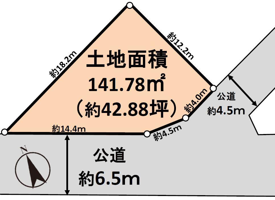 | 建ぺい率・容積率 | 50%・80% | 私道負担・道路 | 無、南西6.5m幅(接道幅18.9m)、南東4.5m幅(接道幅4m) | ||