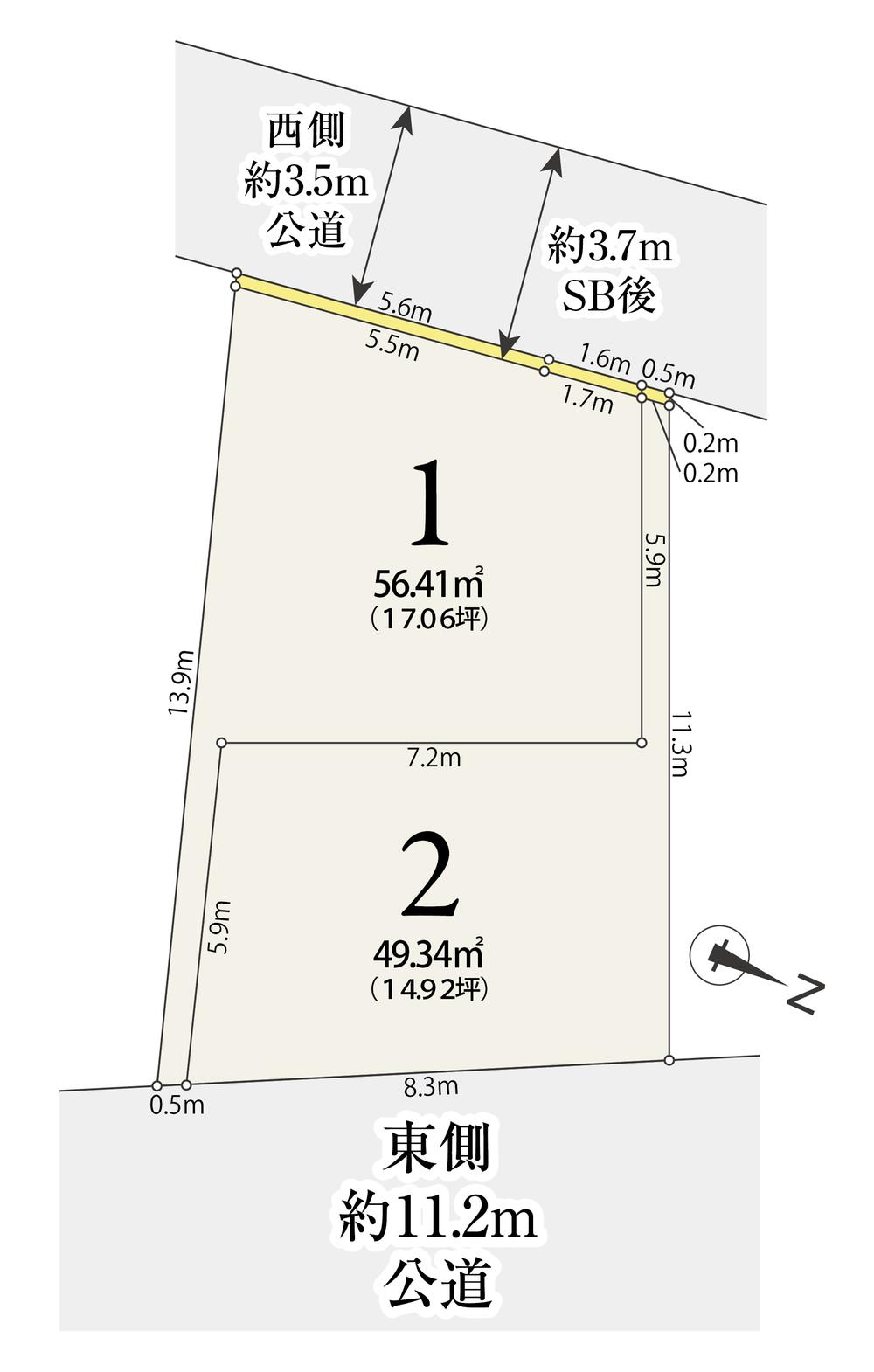 | 建ぺい率・容積率 | 建ペい率:60%、容積率:200% | 私道負担・道路 | 道路幅:3.5m・11.2m、アスファルト舗装、セットバック:0.11㎡~1.61㎡含 | ||