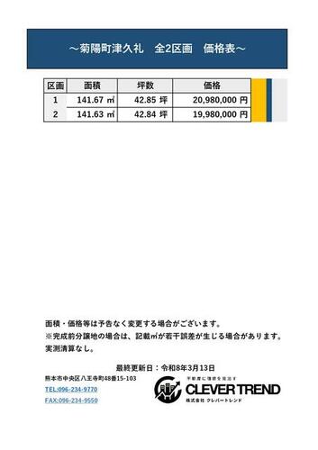 | 備考 | ・図面と現況が異なる場合は現況優先となります。・解体更地での引渡となります。・盛土規制法による規制対象区域内です。・4月30日までの期間限定で、建築条件なしで販売中!・【建築条件なし】残り2区画!菊陽西小学校・武蔵ヶ丘中学校校区 /毎週金曜日に最新情報に更新しています。お気軽にお問い合わせください!・仲介手数料:売買代金の3%+60,000円 / 条件等:更地渡し | ||||